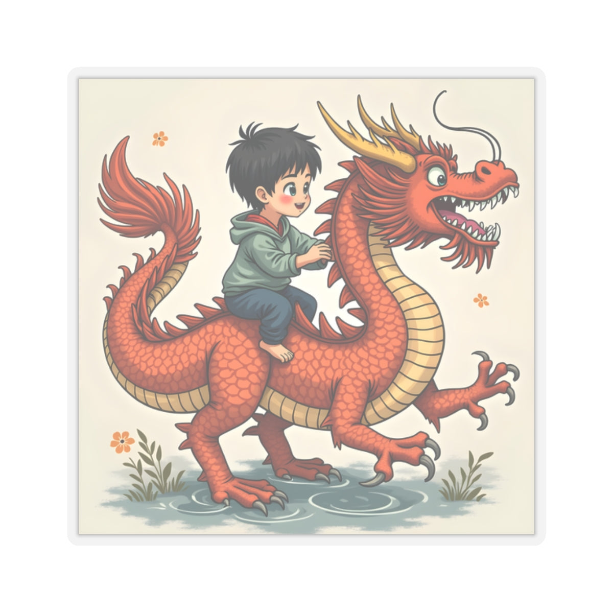 Vibrant kiss-cut sticker featuring a boy on top of a dragon. Perfect for adding a touch of magic to laptops, journals, and more. Ideal for fantasy lovers and those looking to personalize their belongings. Great for birthdays, fantasy-themed events, or simply adding some whimsy to everyday life.