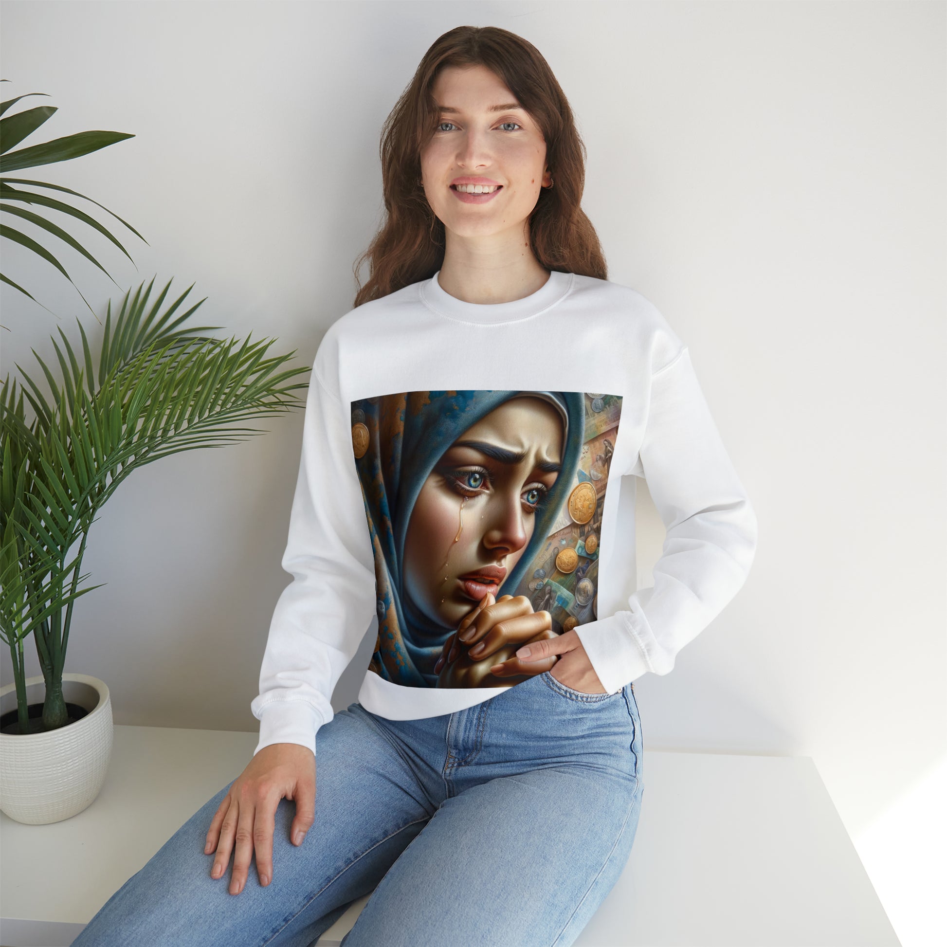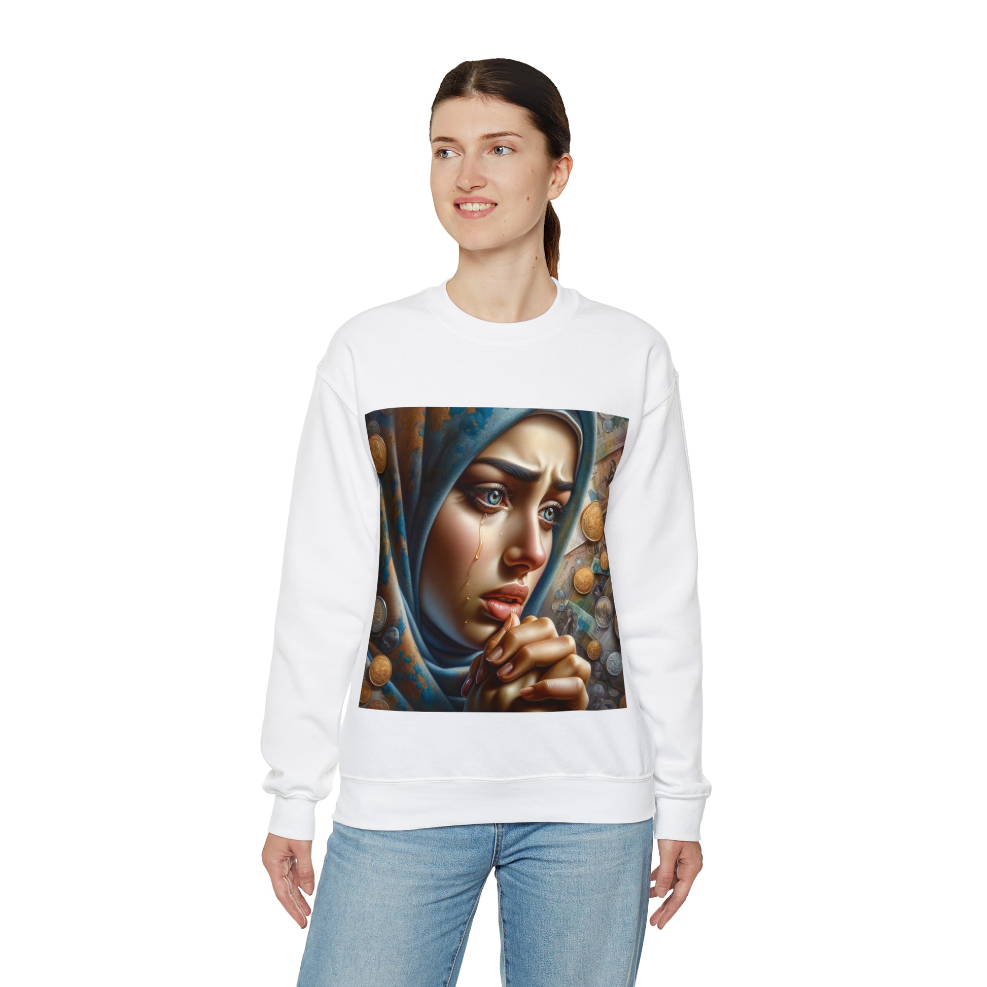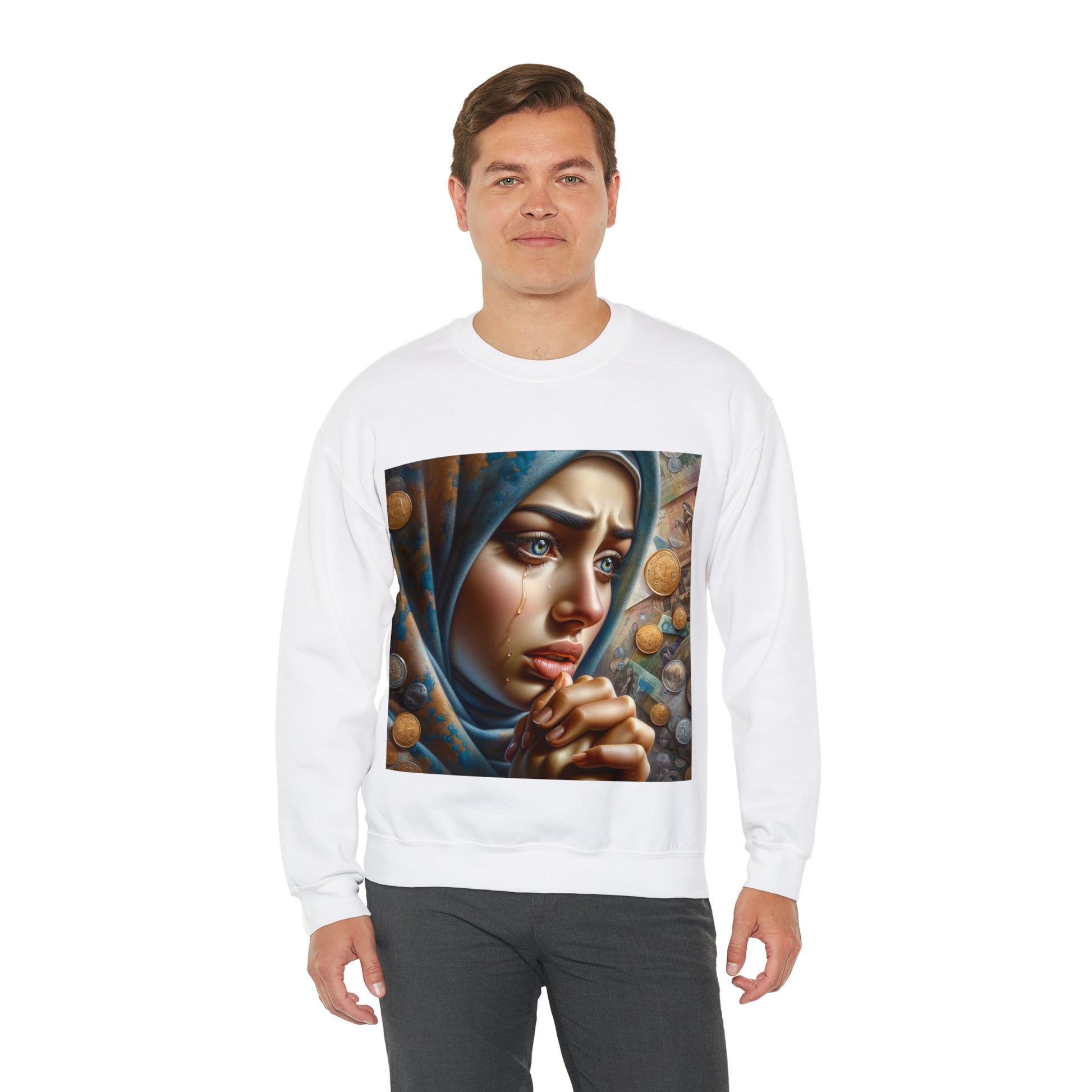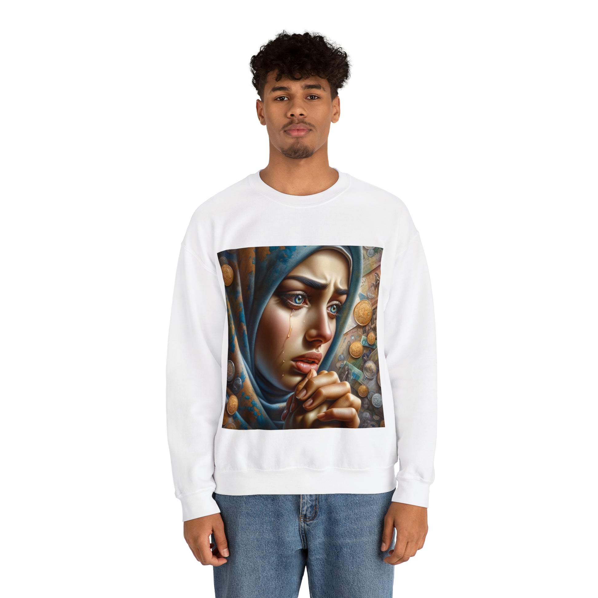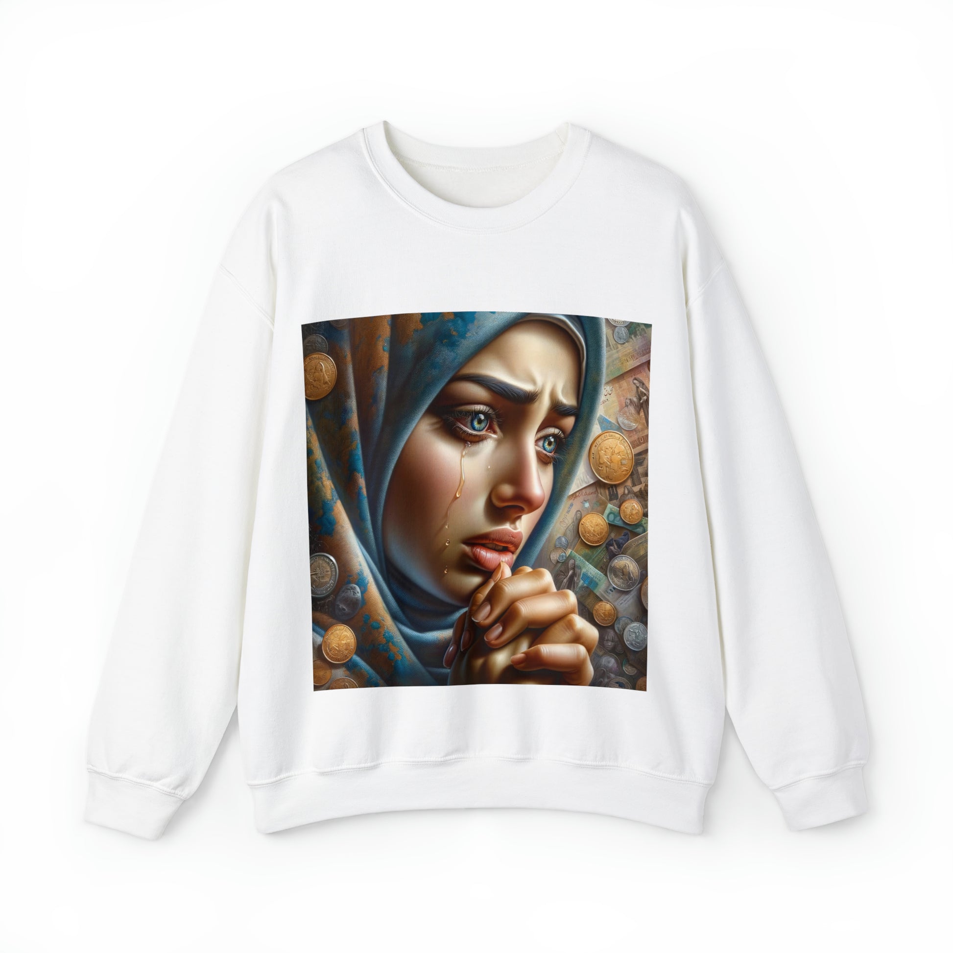 Discover the poignant message of spiritual wealth with our "Can't Eat Money" sweatshirt. This evocative piece of apparel artfully captures the stark reality of a world where material wealth often overshadows the richness of the soul. A striking image of a woman, tears marking her visage amidst a cascade of currency, embodies the profound statement: true fulfillment can't be bought.