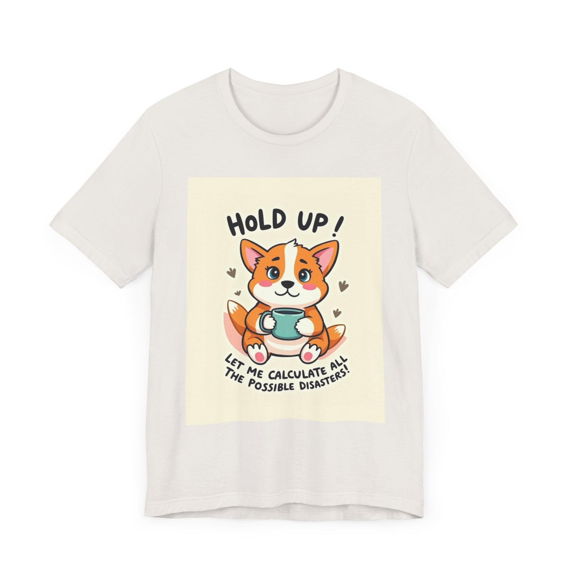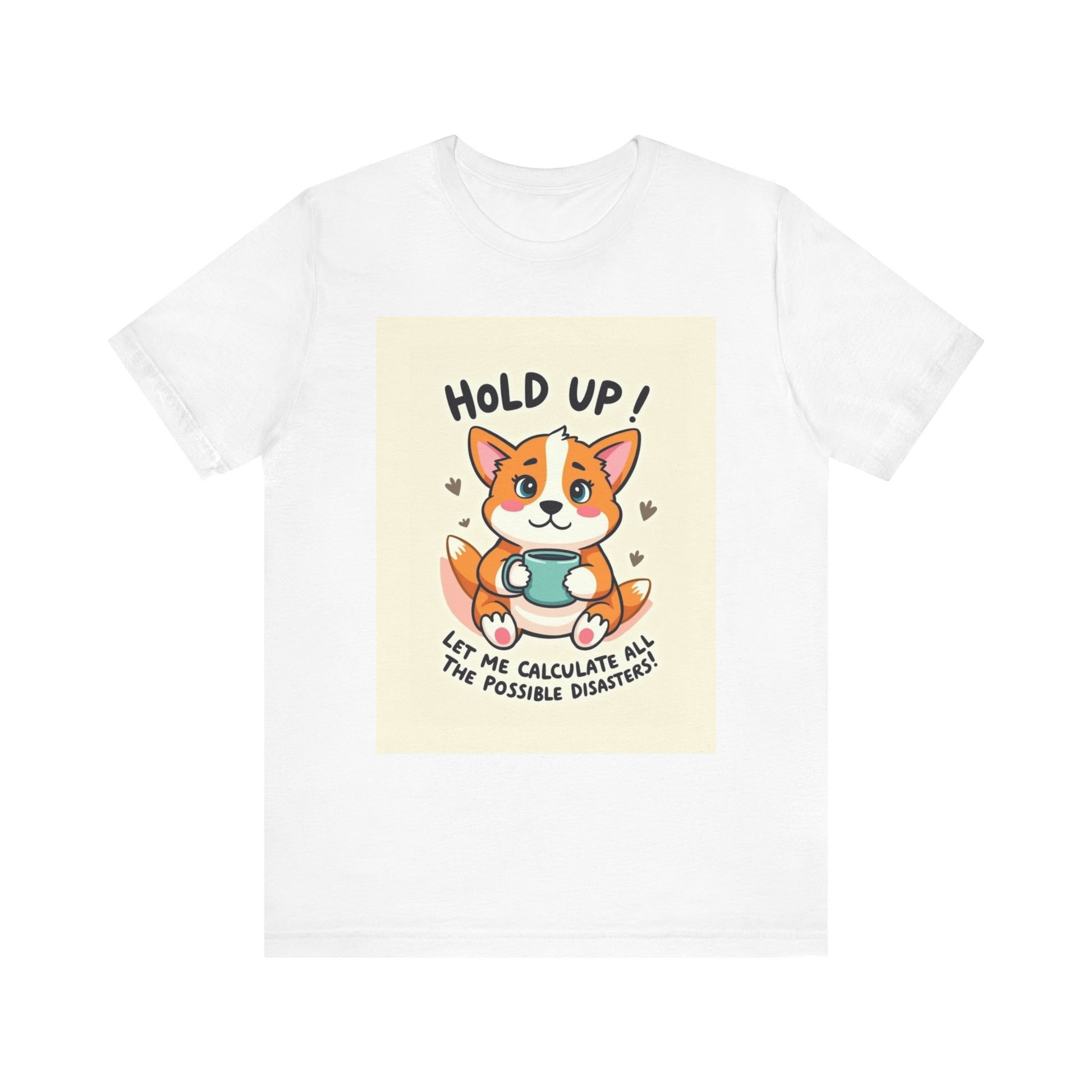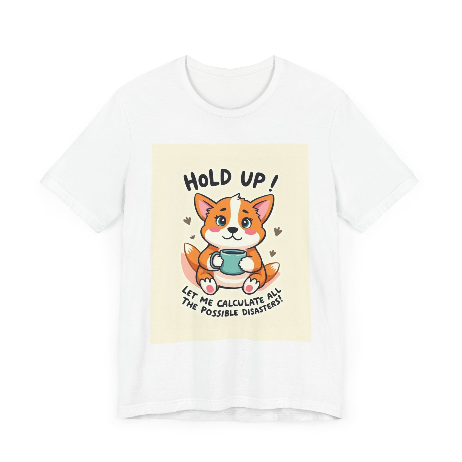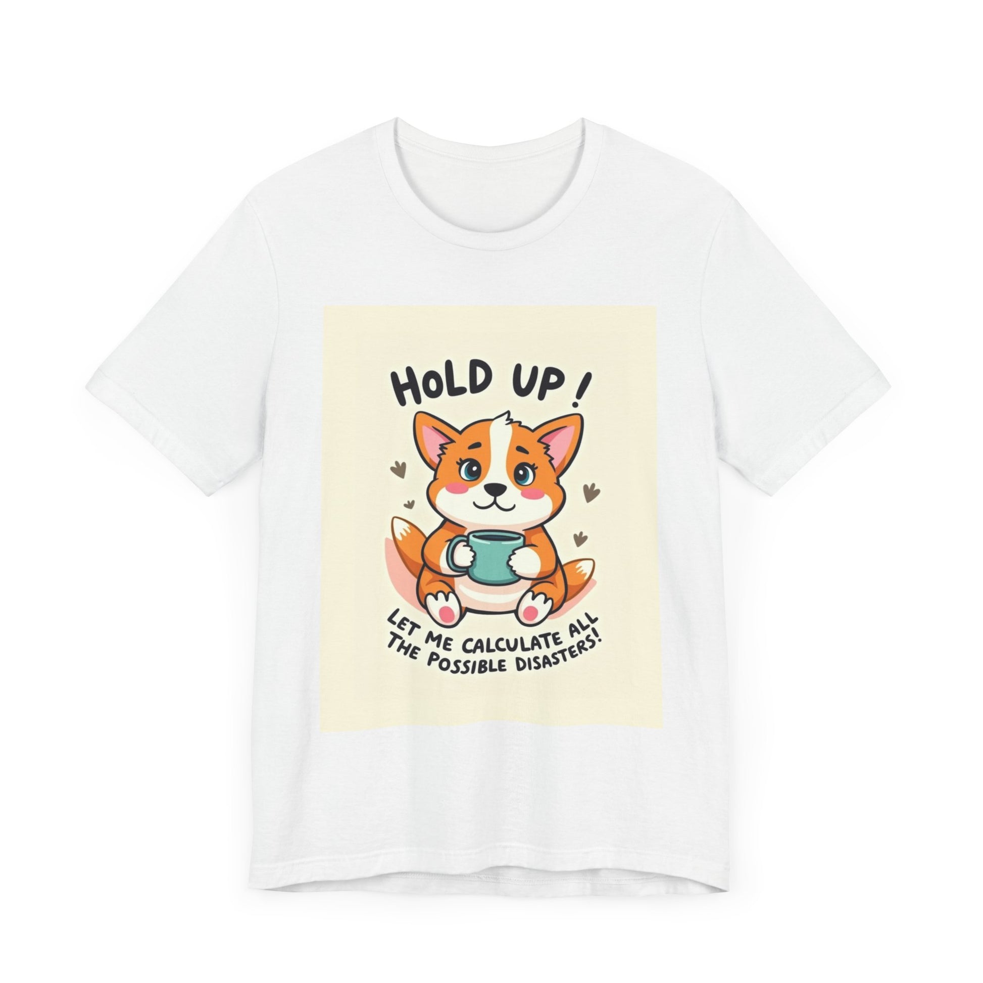 This fun, lighthearted tee features an adorable cartoon corgi clutching a mug, along with the humorous phrase “Hold Up! Let Me Calculate All the Possible Disasters!” Printed on a crisp white background, the corgi’s bright colors and playful expression stand out, making it a perfect choice for anyone who loves a bit of whimsy. Whether you’re a dog lover, a coffee enthusiast, or just someone with a sarcastic sense of humor, this comfy T-shirt is sure to bring a smile to your face—and maybe a dash of caution before diving into your day!