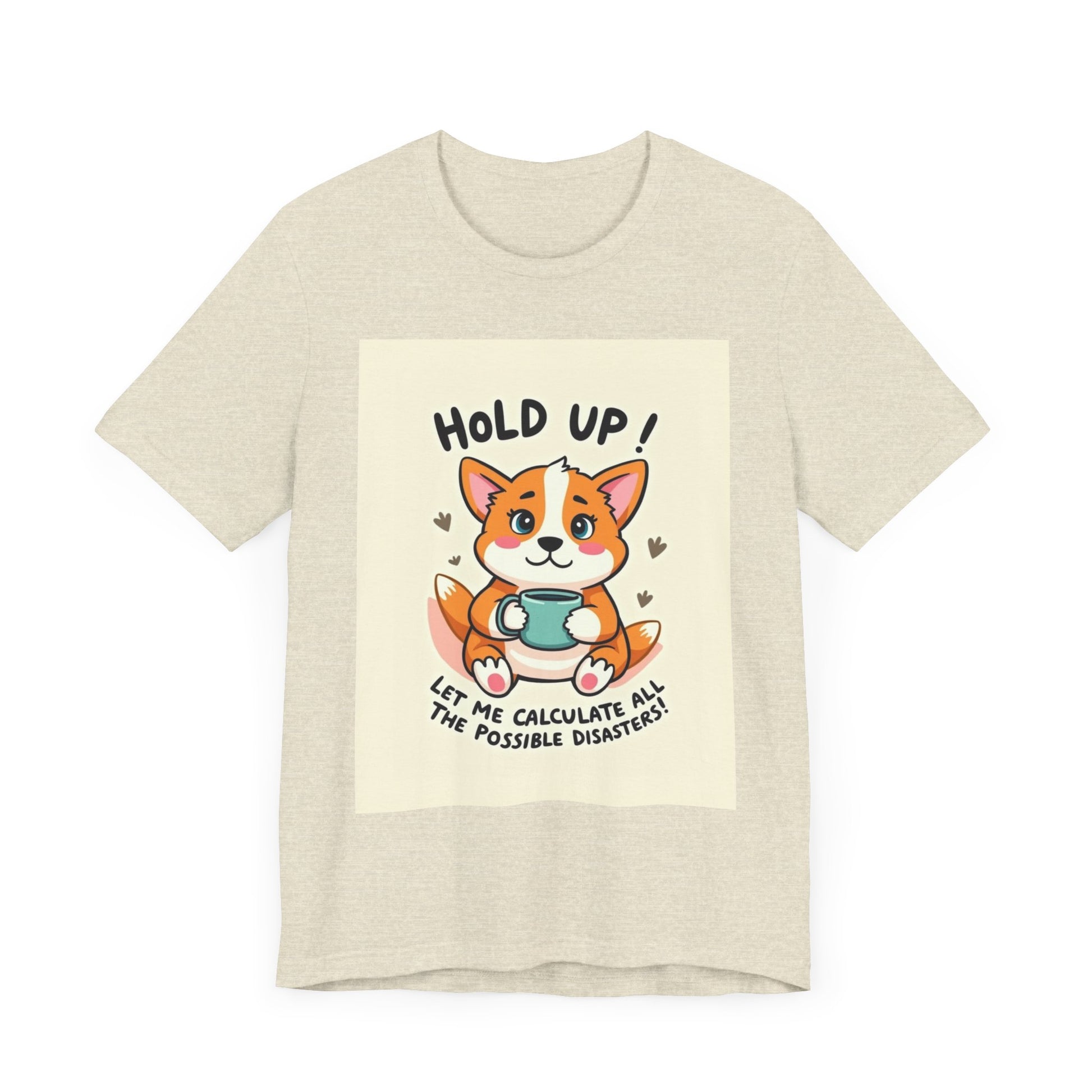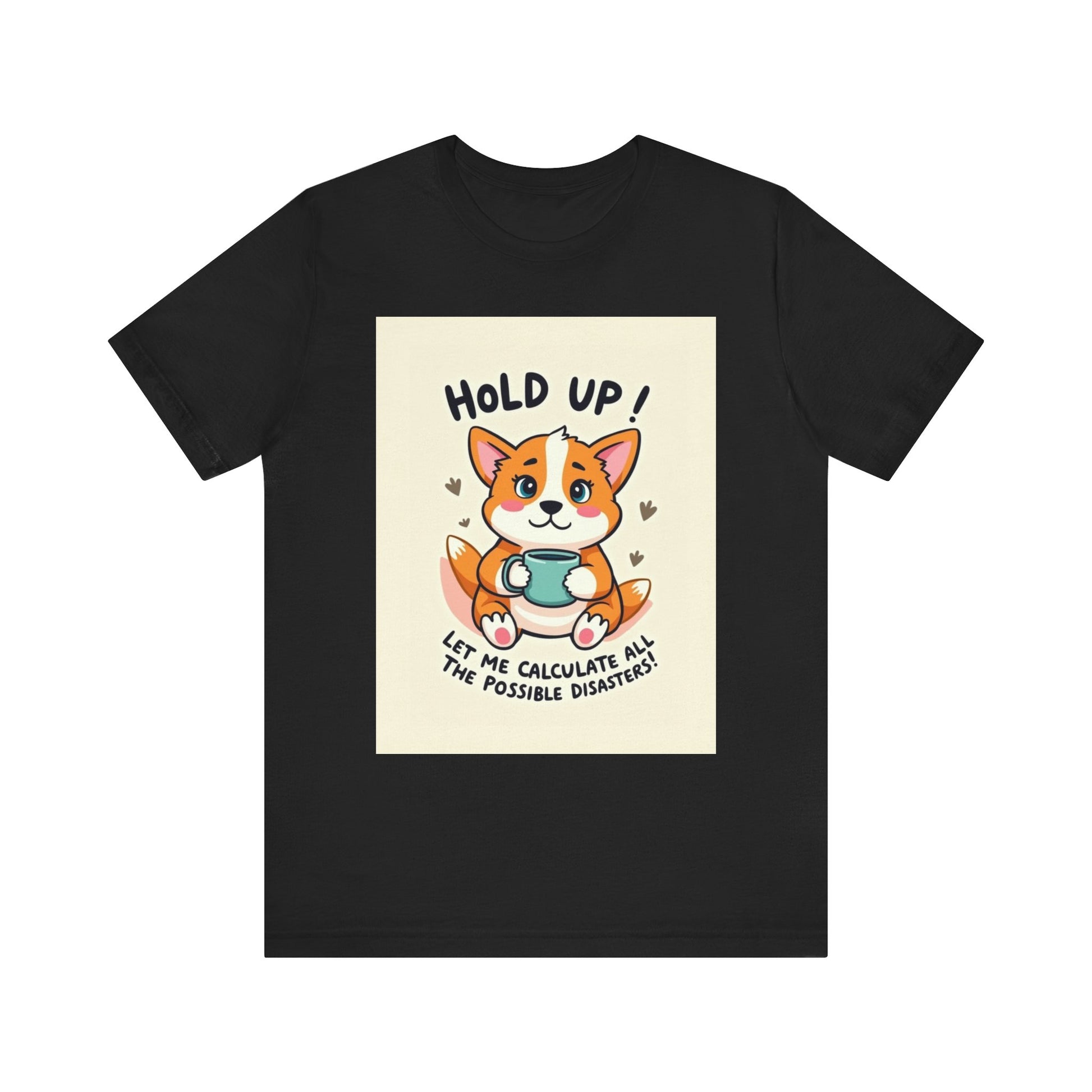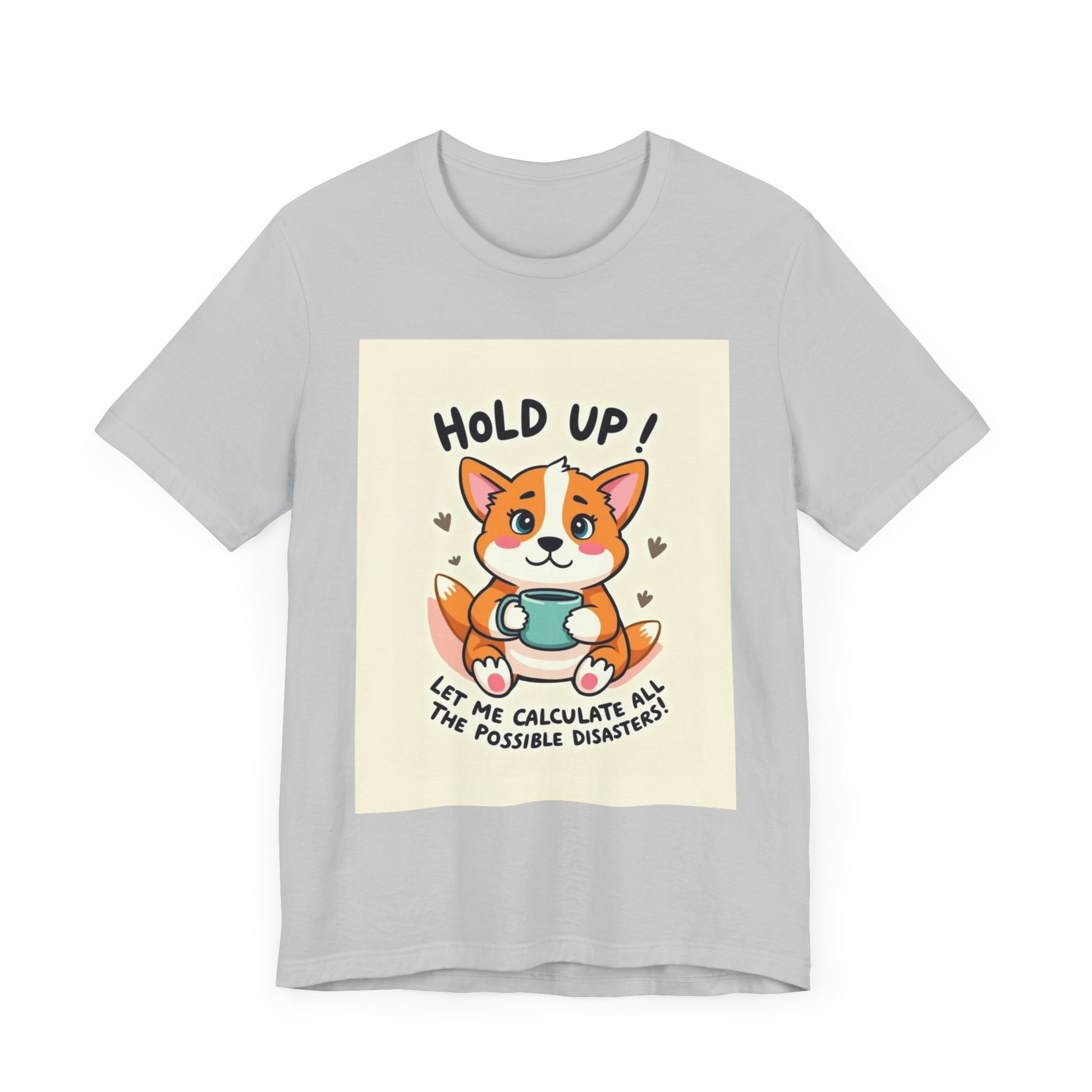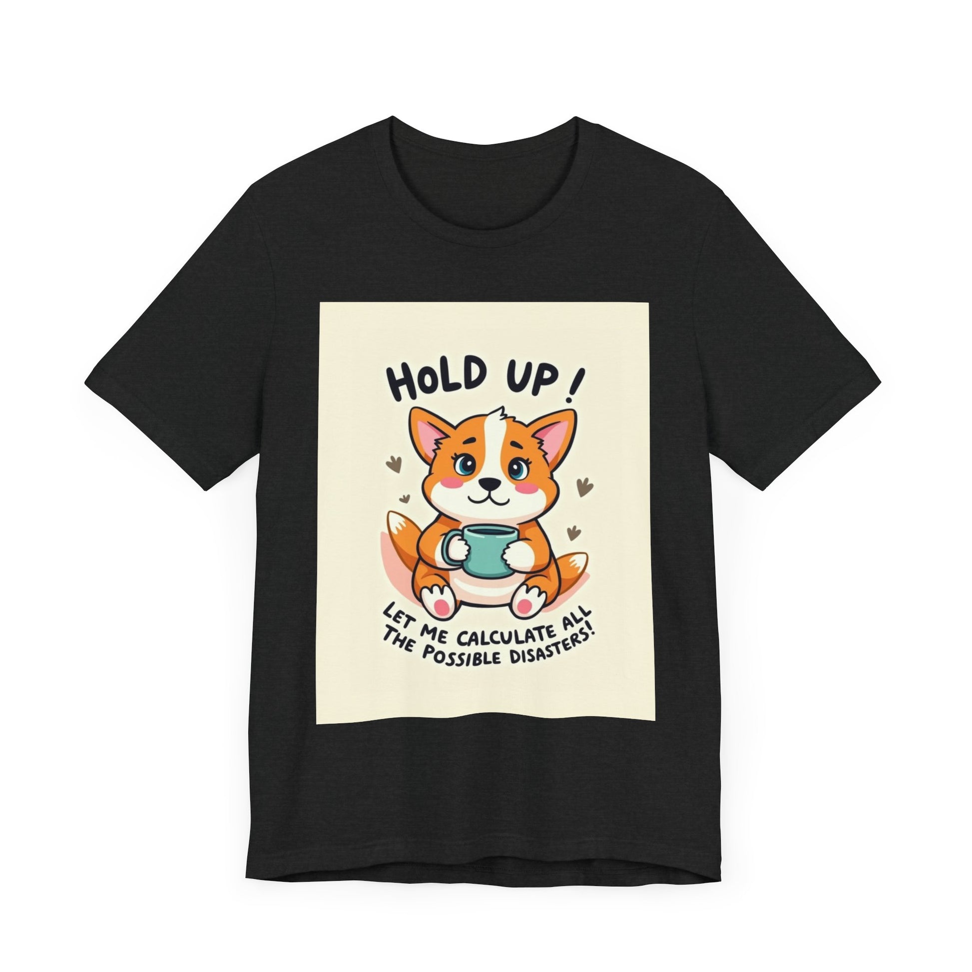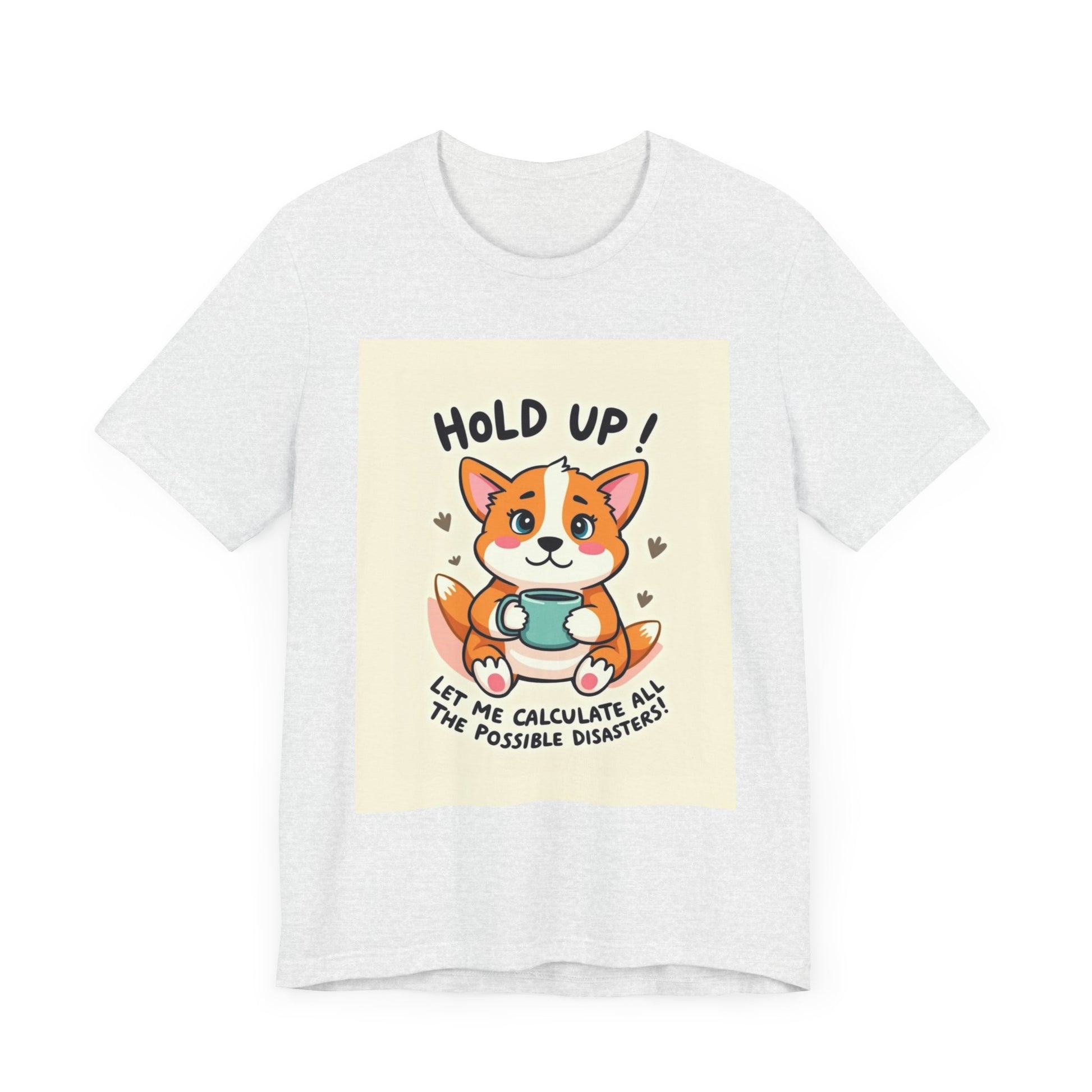 This fun, lighthearted tee features an adorable cartoon corgi clutching a mug, along with the humorous phrase “Hold Up! Let Me Calculate All the Possible Disasters!” Printed on a crisp white background, the corgi’s bright colors and playful expression stand out, making it a perfect choice for anyone who loves a bit of whimsy. Whether you’re a dog lover, a coffee enthusiast, or just someone with a sarcastic sense of humor, this comfy T-shirt is sure to bring a smile to your face—and maybe a dash of caution before diving into your day!